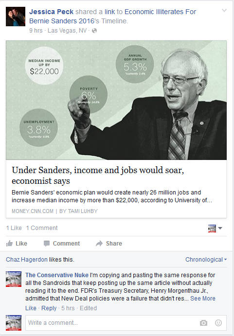 Today’s post is dedicated to my complex, intelligent, factually-based, and well-thought out debates with the Sandroid Bernout Army. I’m just kidding folks, there wasn’t a whole lot of critical thinking going on in the mind of the Sandroids. Only one of the people I asked questions of was somewhat reasonable. You’ve heard me talk of the folks over at Economic Illiterates for Bernie Sanders 2016 before and this is where most of the discussions took place at.