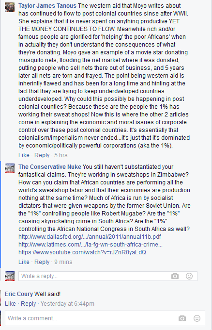 Mr. Tanous had some interesting logic as well; the “1%” are keeping Africa to perform sweatshop labor yet also stopping all economic development. I’m not certain how that works, especially when countries like South Africa are ruled by the socialists in the African National Congress and communist dictators rule Zimbabwe. What’s up with progressives and thinking that their opponents base everything off of Fox News?